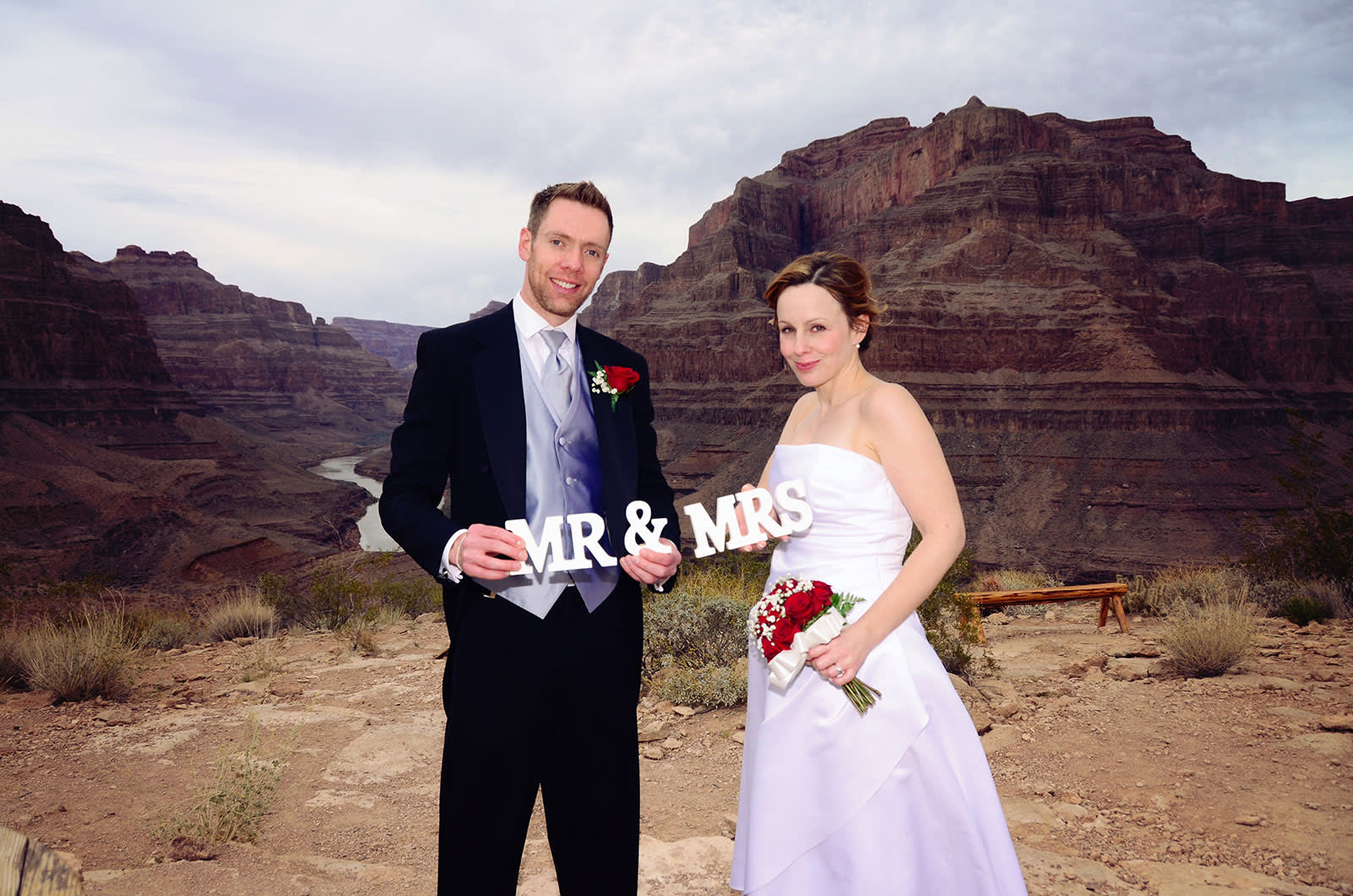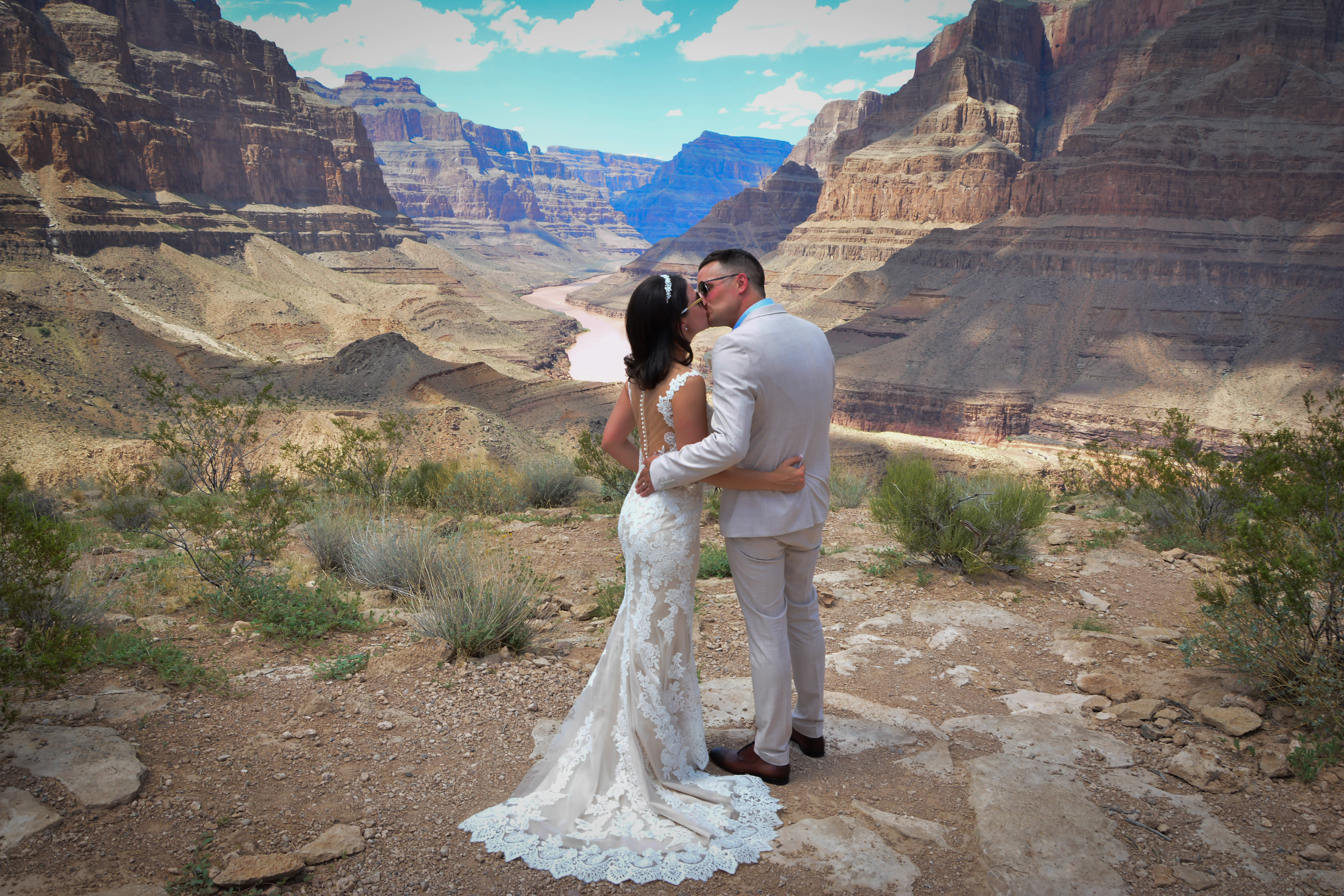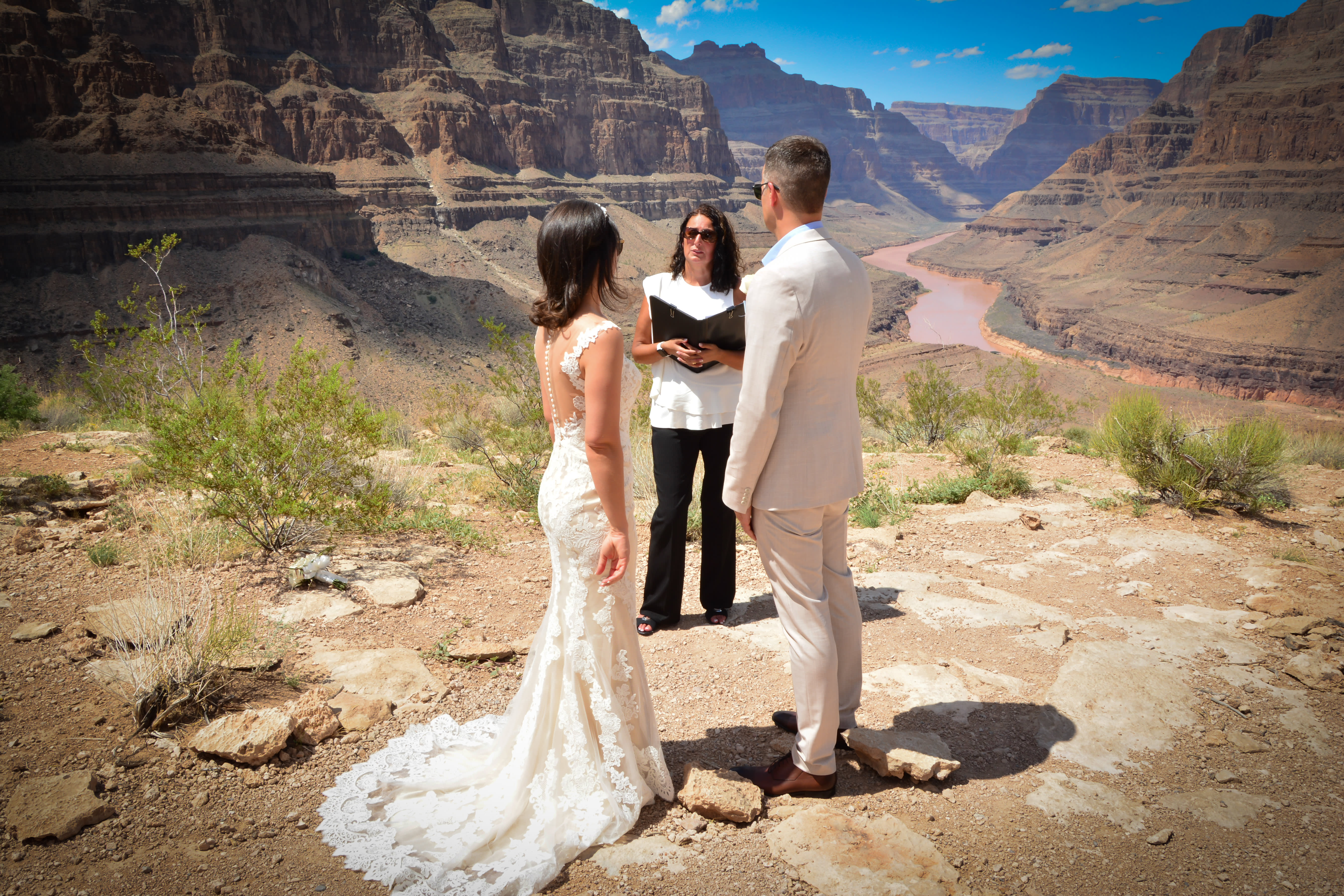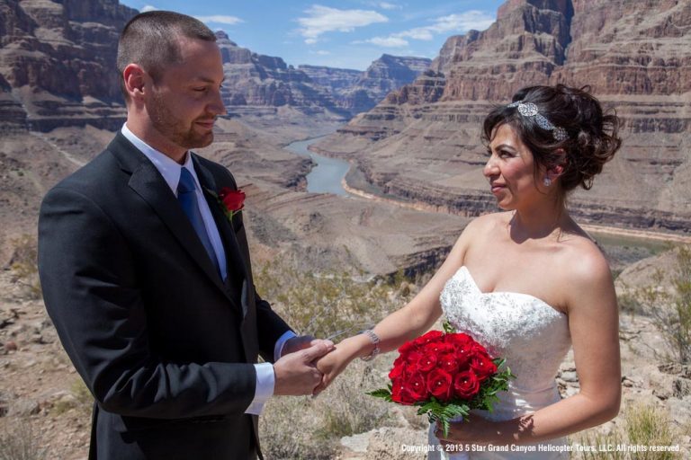 Your wedding and tour flight experience will be narrated by our experienced Pilot, who will provide comprehensive information through a two-way headset. You will fly past extinct volcanoes, and over Historic Indian Territory, before you descend below the rim of the Grand Canyon. Now imagine landing deep inside the Grand Canyon on an exclusive plateau – only accessible by helicopter overlooking the mighty Colorado River. Here you will exchange vows in one of the Natural Wonders of the World!